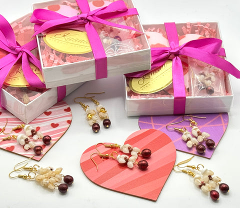 Niihau Momi shell with gorgeous dark red freshwater pearl dangles. They come wrapped and ready to go for your special someone.
