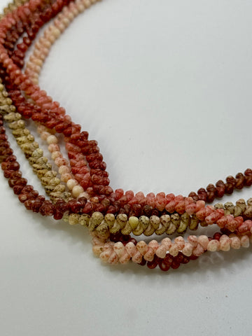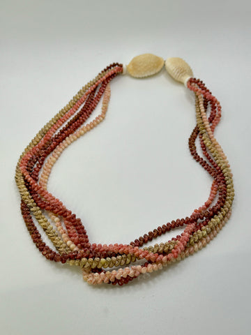 20 inch, five strand, five color all Niihau Kahelelani shells. This is a gorgeous collection all in one Lei. Pink, green, red, brown and light pink strands with traditional double Poleholeho shell closure.